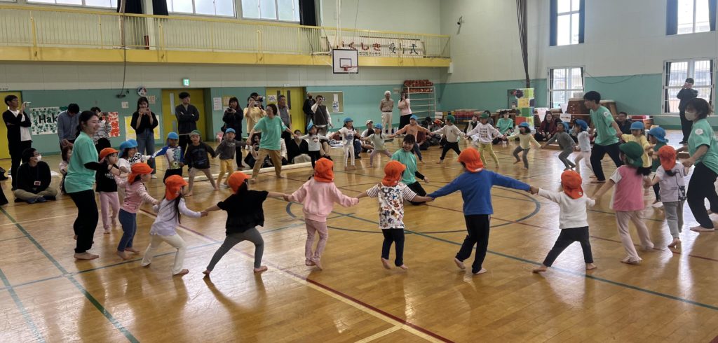 また、幼児の3クラスは、30人以上の年齢の違う子ども達がその場で友達を誘い、手を繋ぎあい最後までその手を離すことなく「糸車」を成功させました。