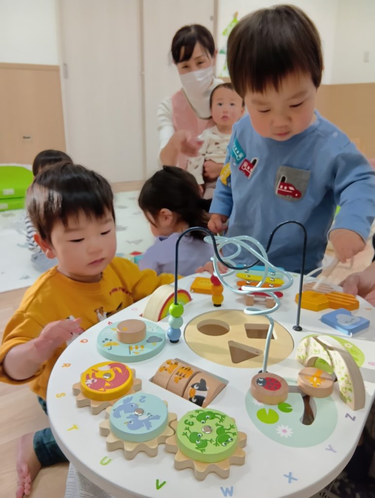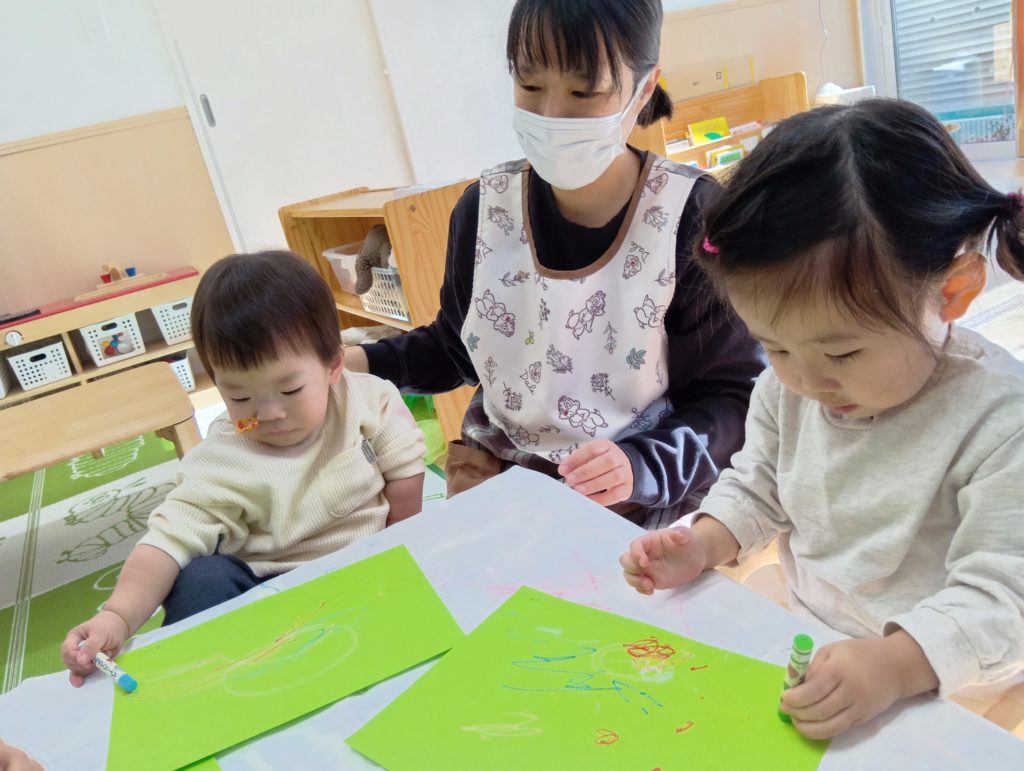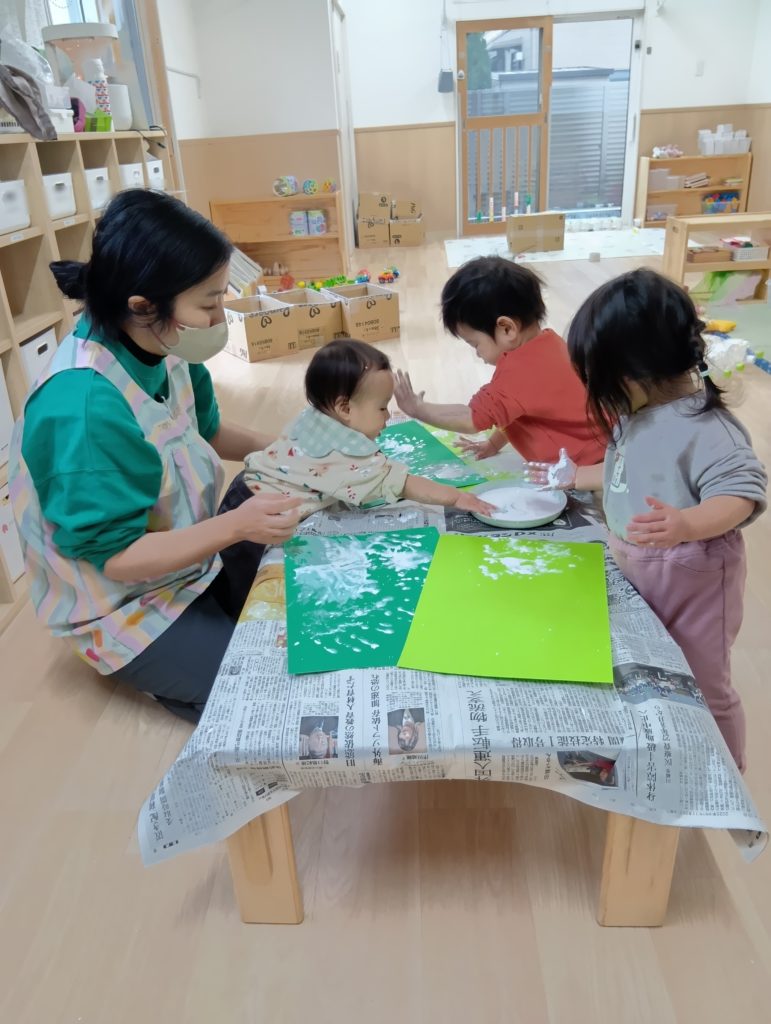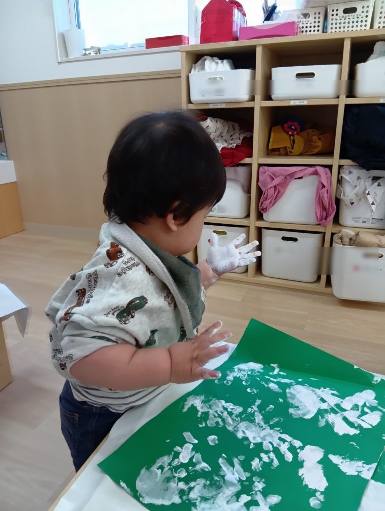Liko(0歳児クラス)の子ども達は絵の具あそびを楽しみ、