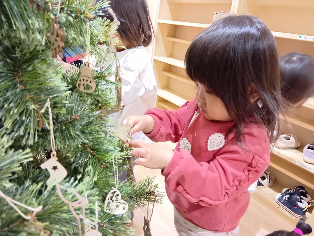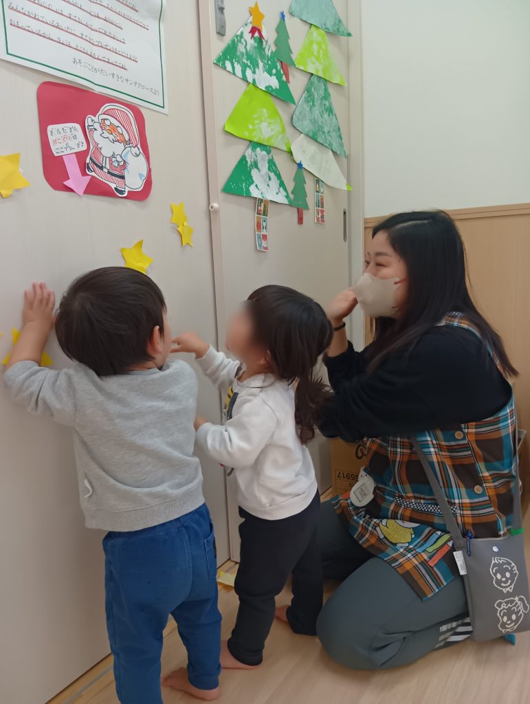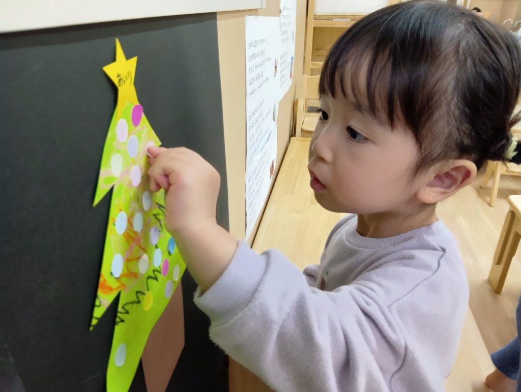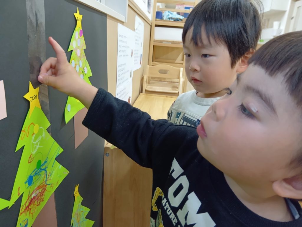 Ulu(1歳児クラス)の子ども達は、クレヨンやシールを使いながら、遊んだ遊びの跡をクラスのクリスマスの飾りとしてかざり、毎日のようにクリスマスの歌を歌い踊りながら過ごしました。