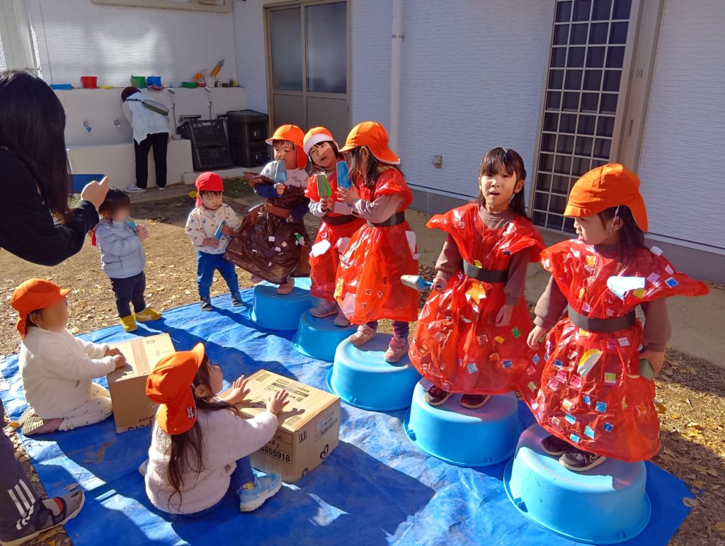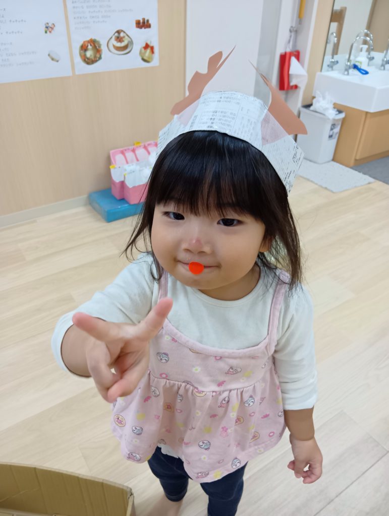 また、Hoi組は最近お気に入りのクリスマスカラーの洋服にクリスマスのモチーフをクレヨンで塗り、自分で切り取り、洋服の柄にしてサンタやクリスマスツリー、トナカイになって園内を遊び続けました。