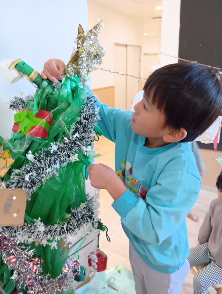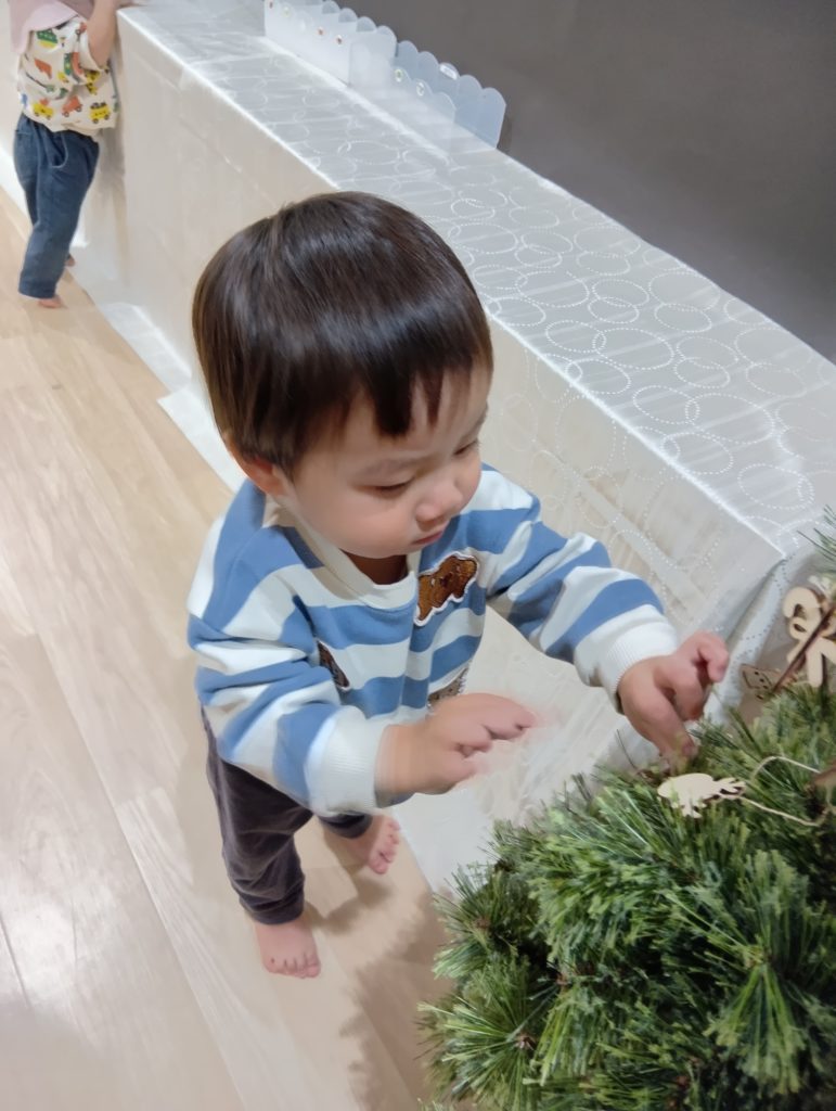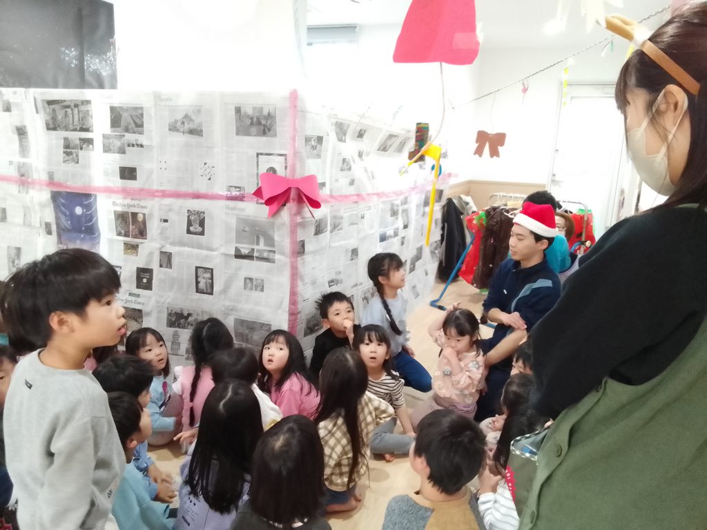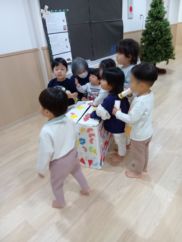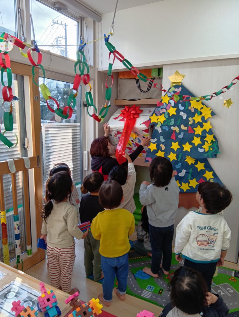 そして、Kai(2歳児クラス)の子ども達は、プレゼントを入れてもらおうと大きな箱にクリスマスのモチーフをのりづけし、「どこに置いたらサンタさん見つけてくれるかな?」と園内あちこちにこの箱を置いてはサンタのプレゼントを待っていました。