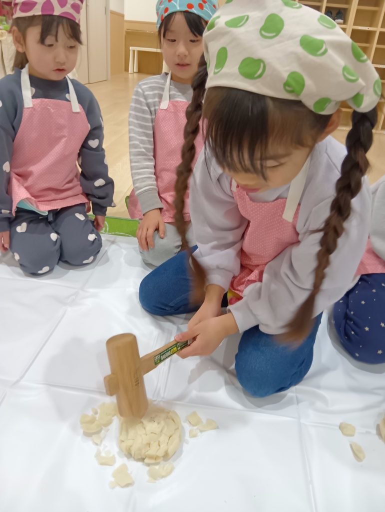 年が明け、「お正月」という行事を知る中で、「七草」を探しに公園やスーパーに行ったり、玄関に飾られた本物の「鏡餅」にひびが入っていく様を見ながら、「やってみたい」が動きました。