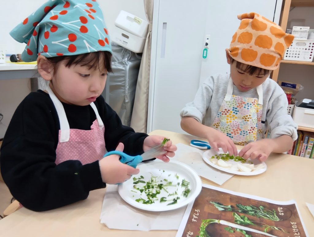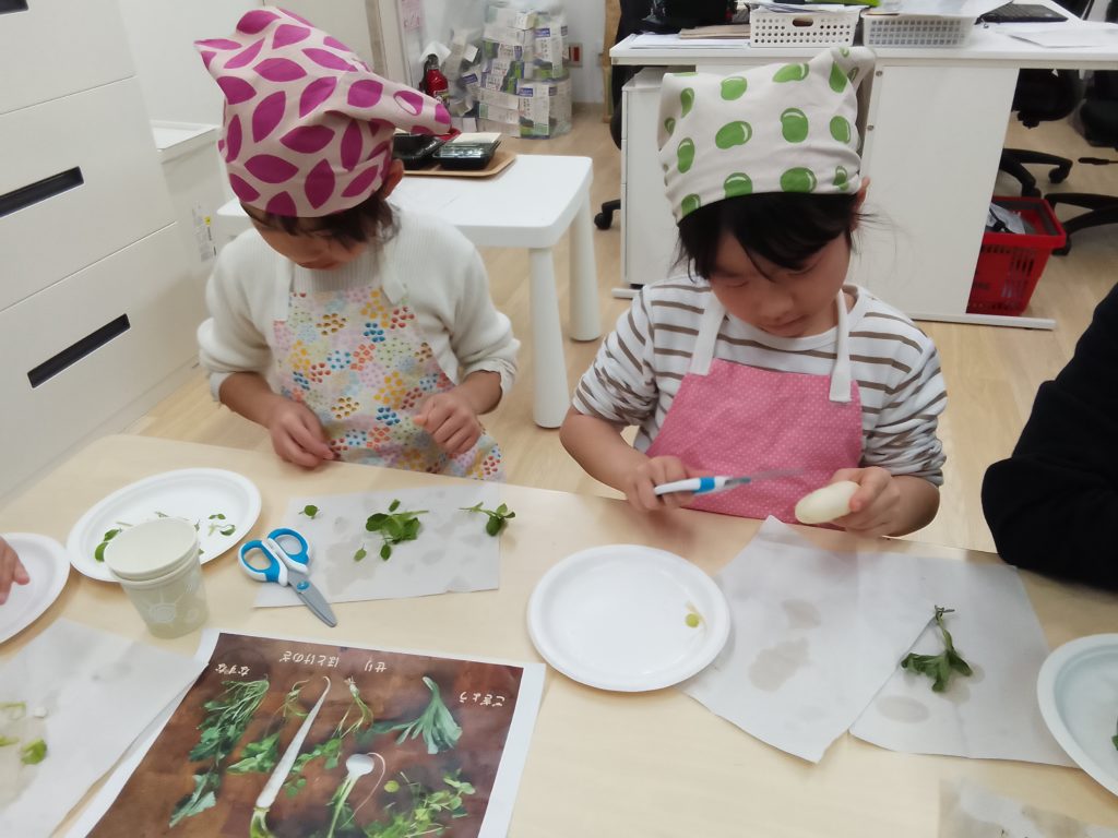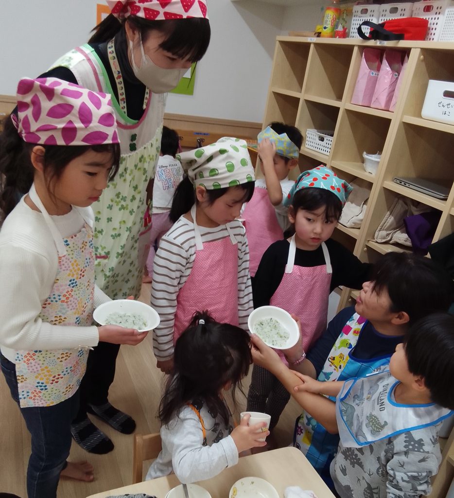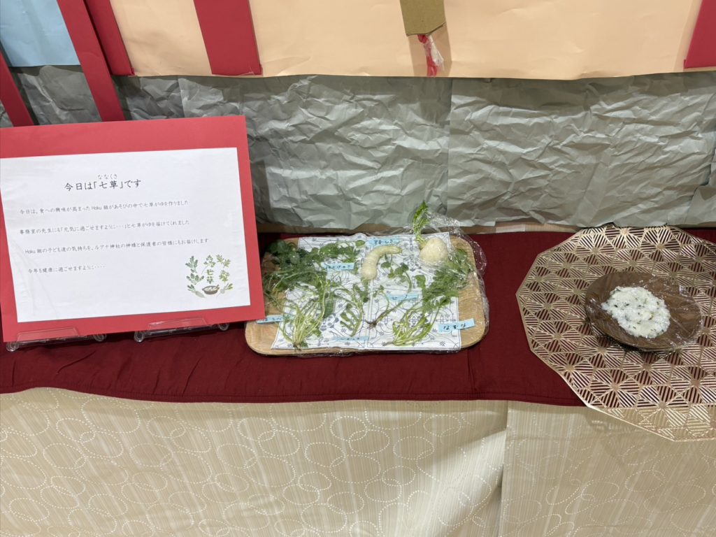 年下の子ども達は、その後、Hakuの子ども達が買ってきてくれた本物の七草を受け取り、クラスで触れて遊び、給食では「菜飯御飯」や「大根の澄まし汁」を食べました。