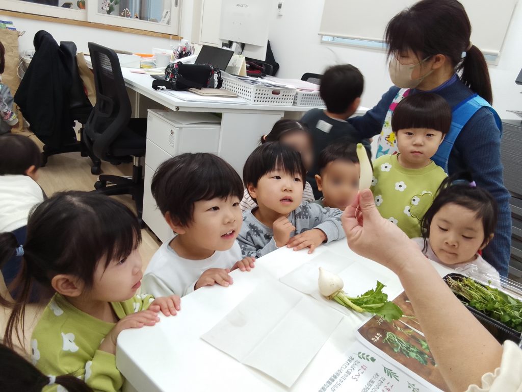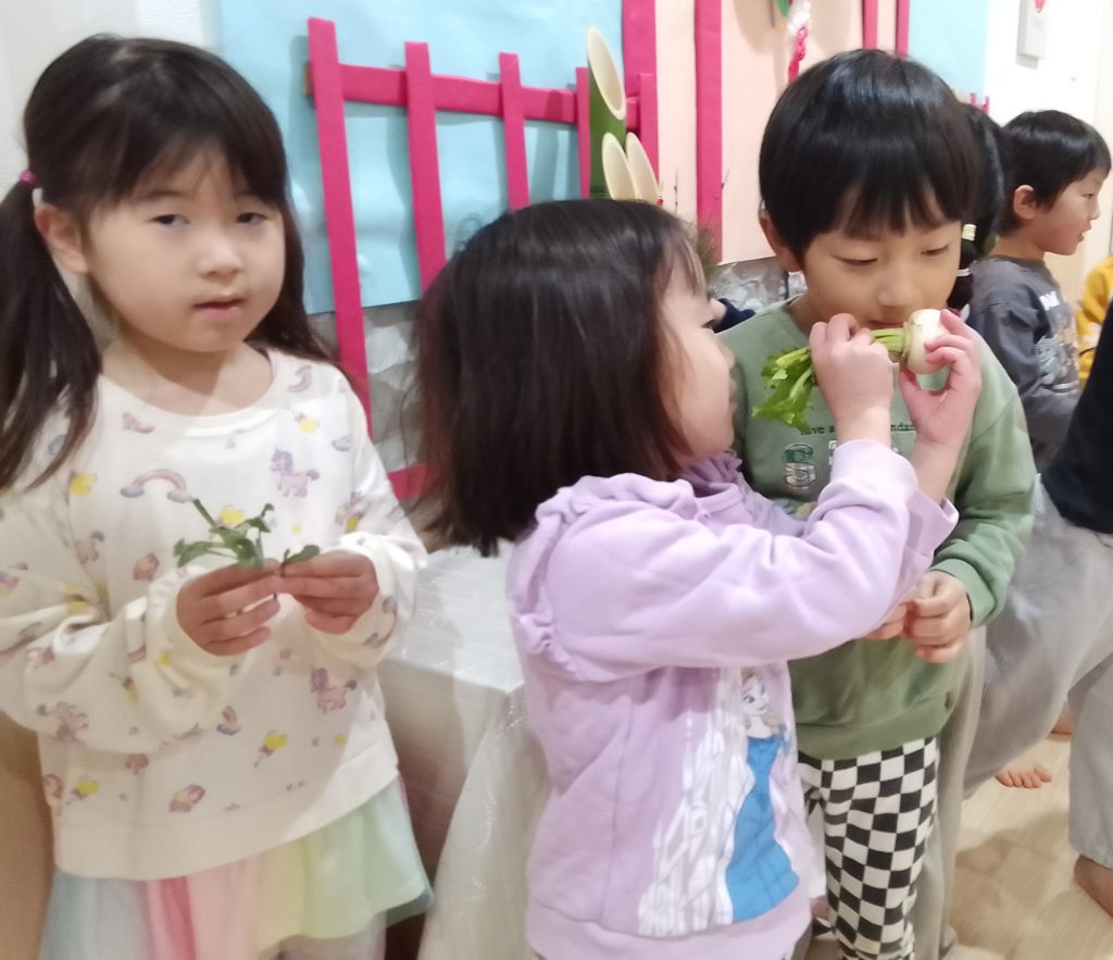 また、Kai(2歳児クラス)の子ども達は、「くさい」と表現する野菜の香りを、この日のご飯は「いいにおいだね」と表現し、野菜を身近に感じたようです。