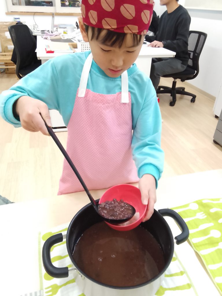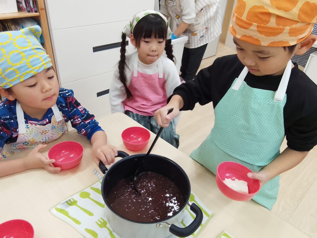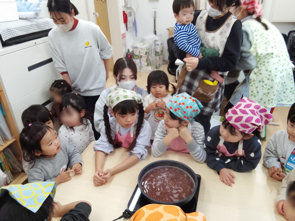 そこで、七草の日と同様、子ども達は、時間をかけ、小豆を煮て、お汁粉を作りました。