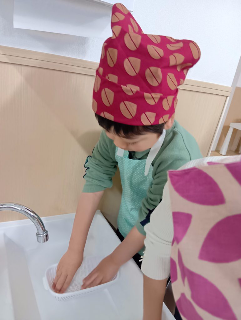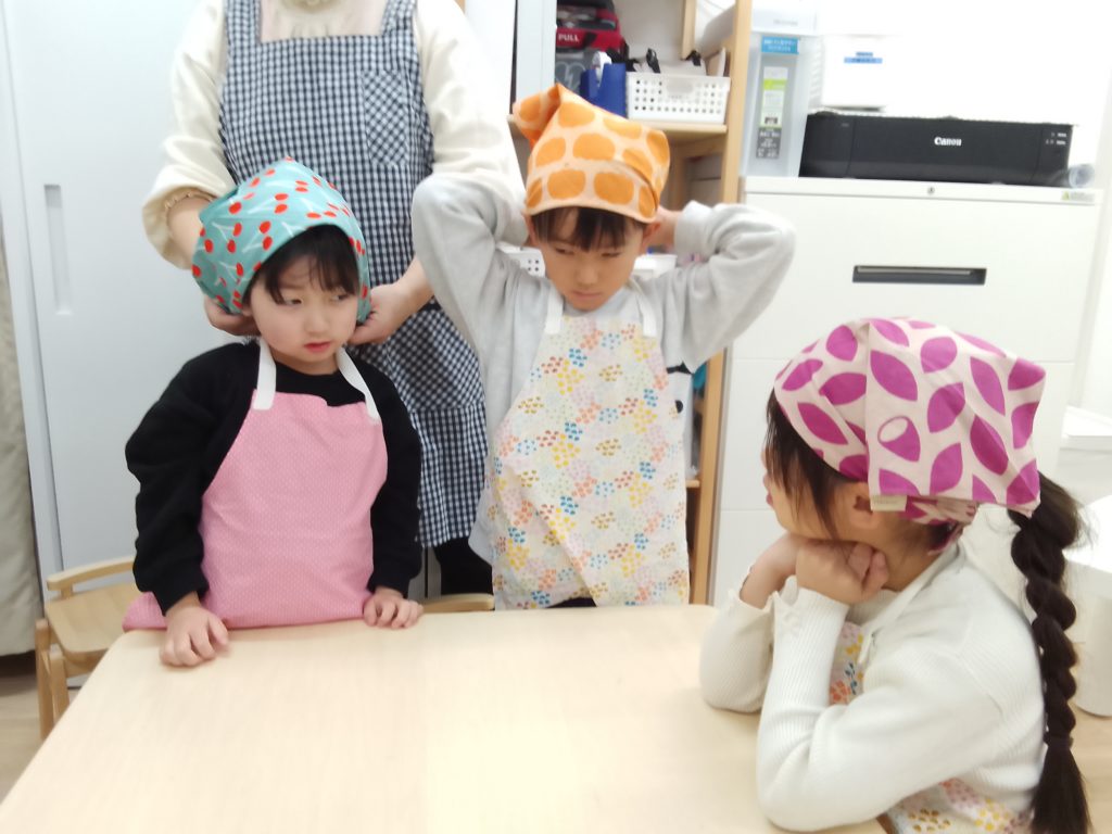 エプロンや三角巾を自らつけ「ひもを結ぶ」経験をしました。