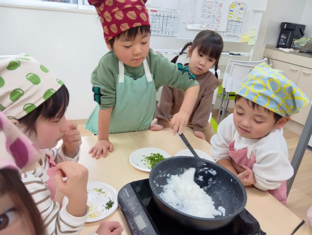 この日の七草がゆ作りは、年下の子ども達にも伝わり、七草がゆを感じる為に、全てのクラスが事務室にやってきました。