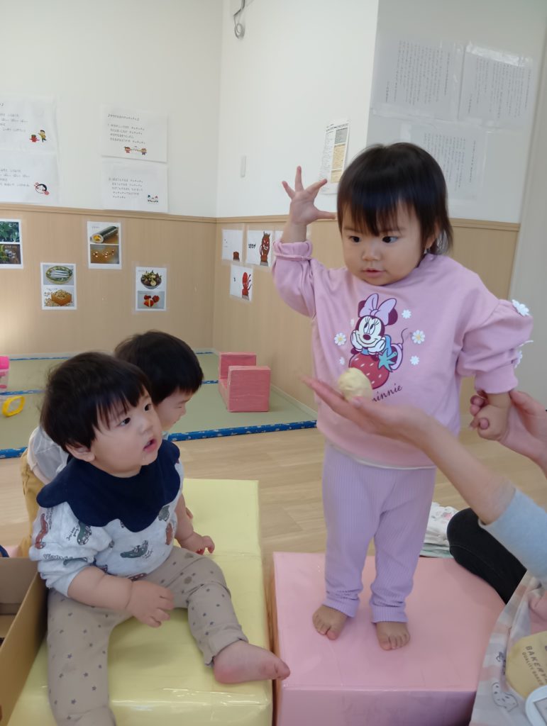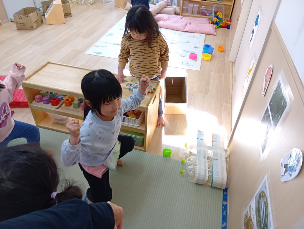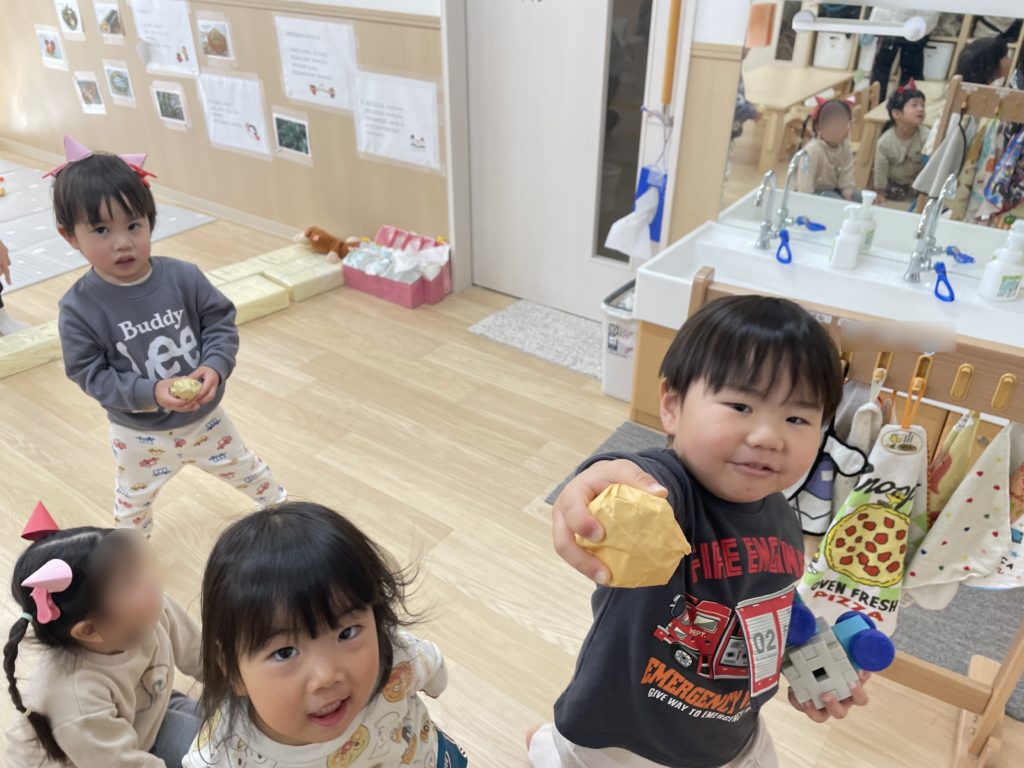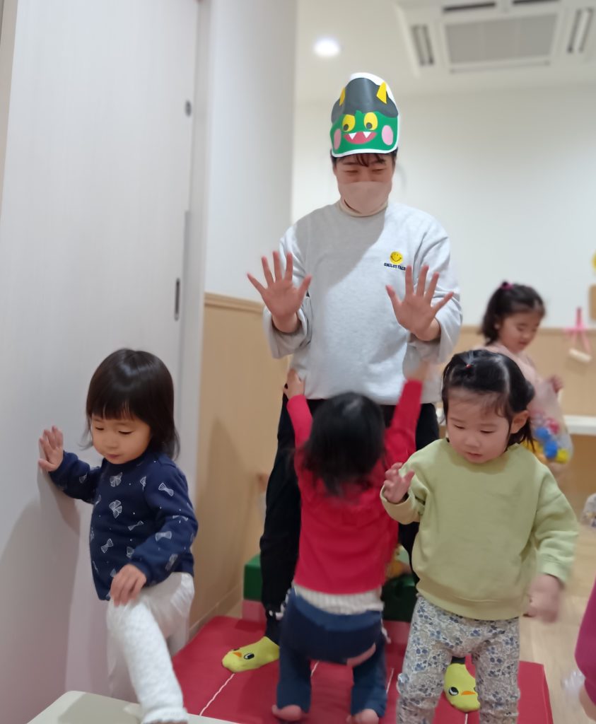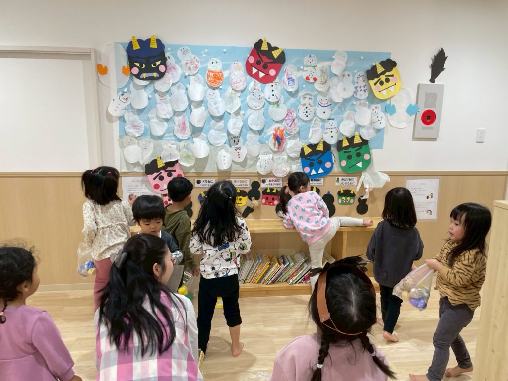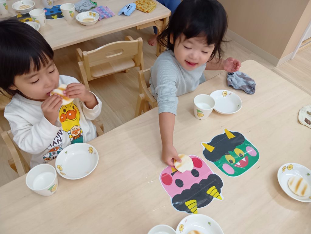 それ以来、絵本の世界から飛び出した鬼と「あっぷぷ~」とにらめっこをしてみたり、自分も鬼になってみたり、鬼とおやつを食べてみたり、お部屋の鬼と豆まきをしたりとの鬼との毎日を楽しみ始めました。