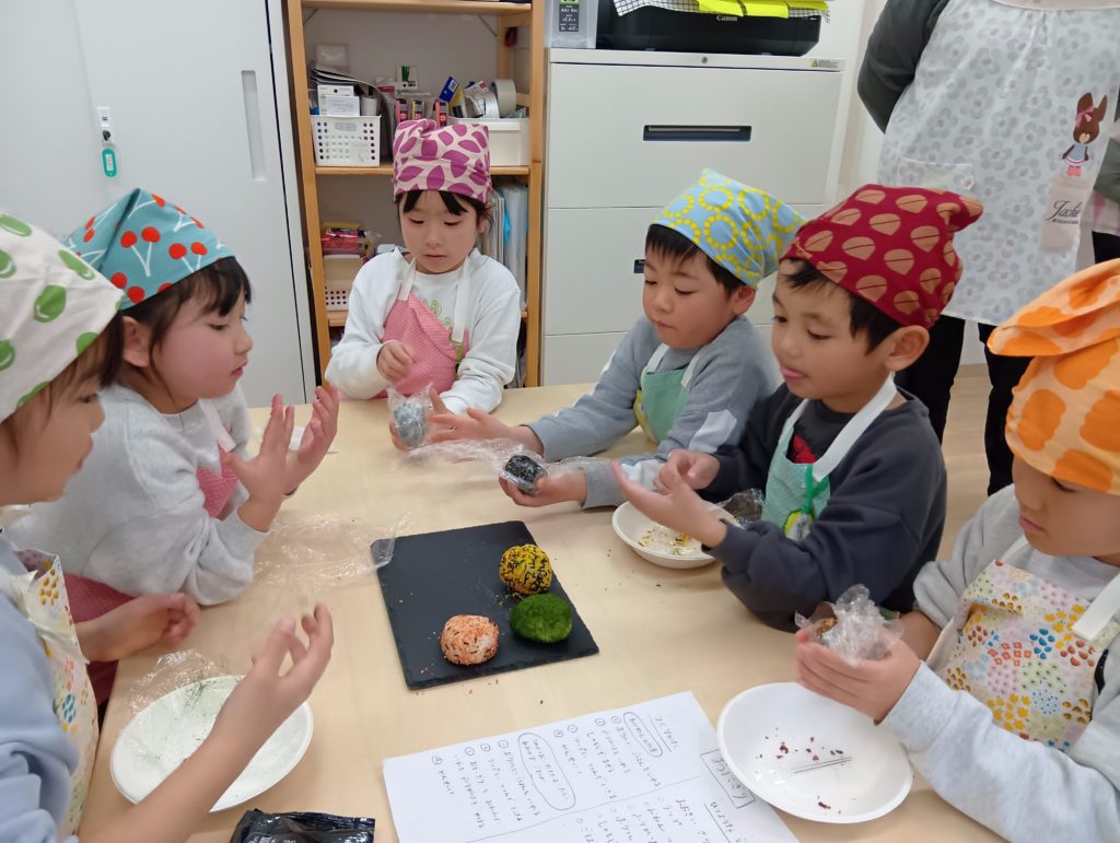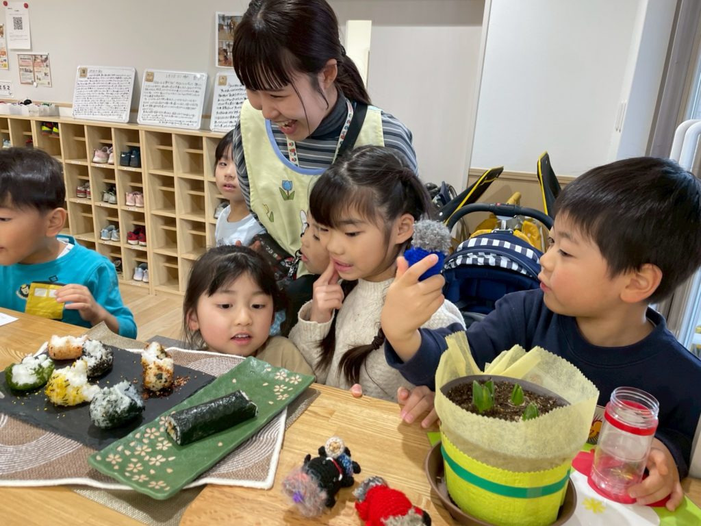 その一方で、Hakuの子ども達は、「まゆとおに」という絵本から「鬼と友達になる方法はおにぎりをつくって鬼に食べてもらうこと」を考えました。