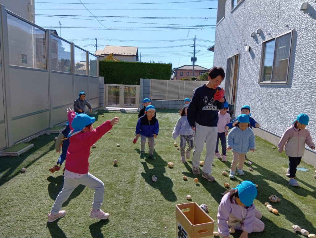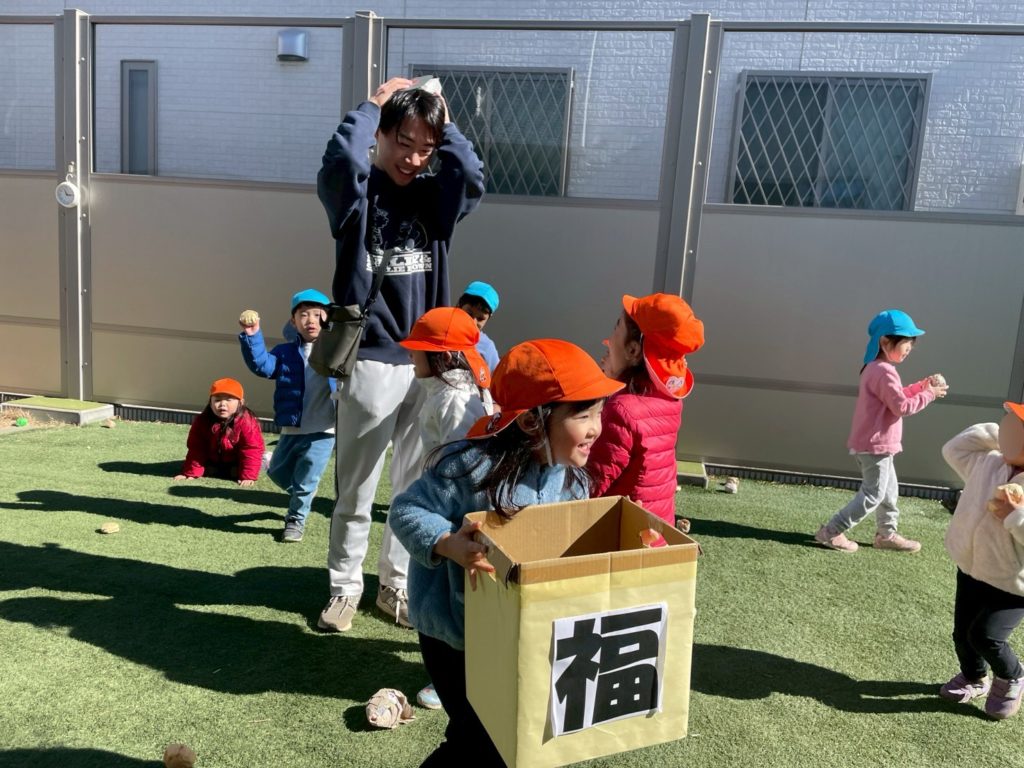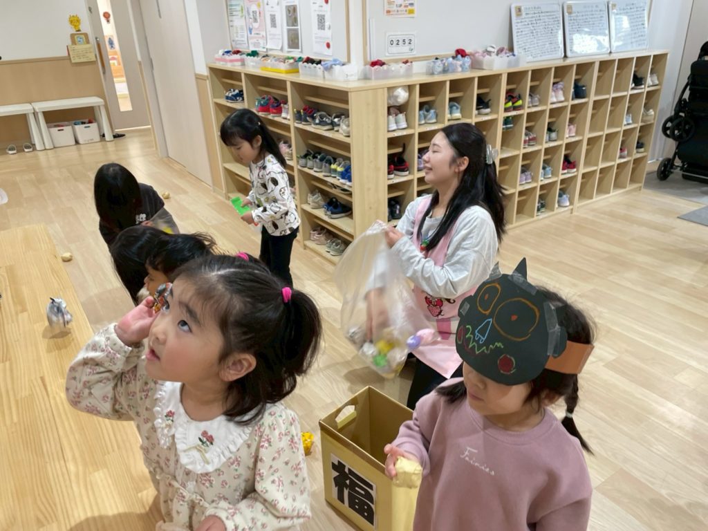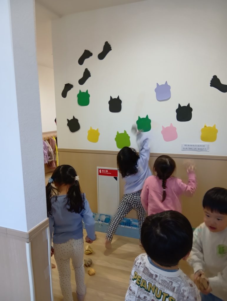 節分当日、子ども達は、鬼と一緒に豆まきをしてあそびました。