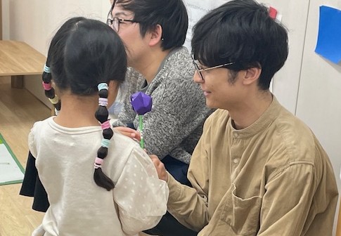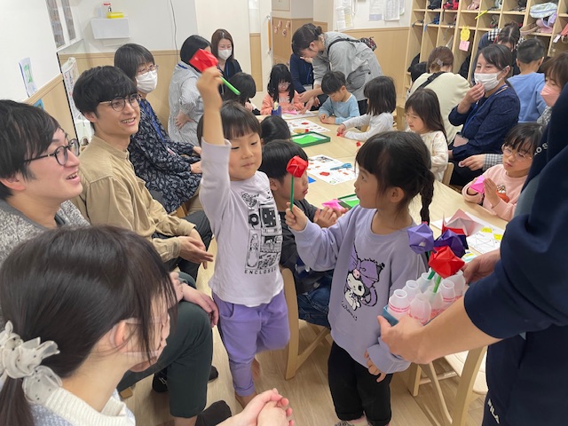 そして、みんながお店屋さんになって「いらっしゃいませ」とお花屋さんごっこを楽しみ、最後には今日来てくれたおうちの方にサプライズのお花のプレゼントも渡しました。