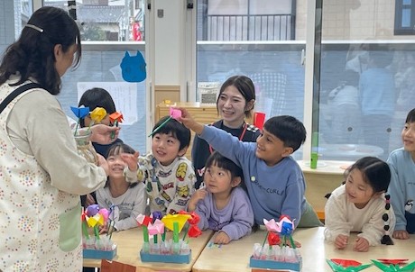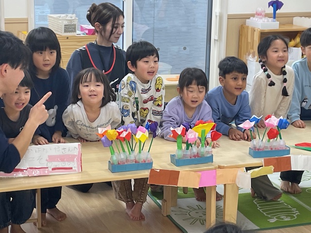 「私の好きなお花はチューリップなんだ」自分のマークを好きなお花として話してくれた子の一言から、折り紙でお花を作り、お花屋さんごっこを楽しんでいました。