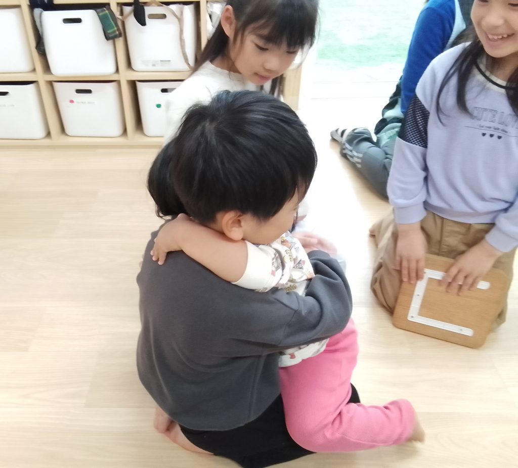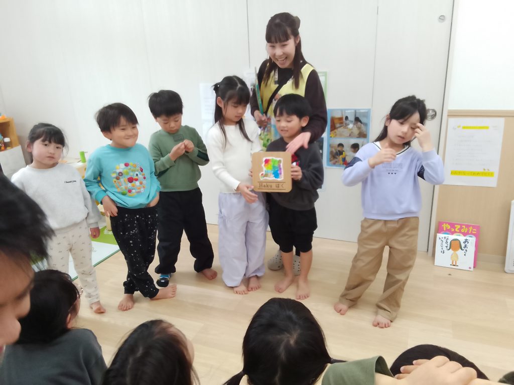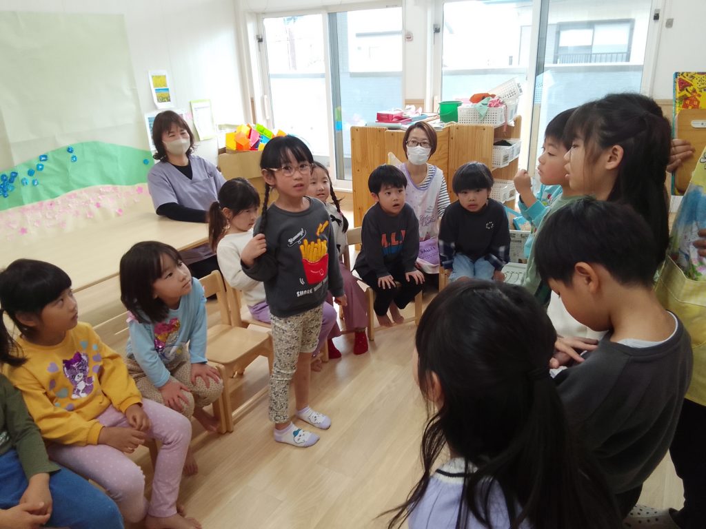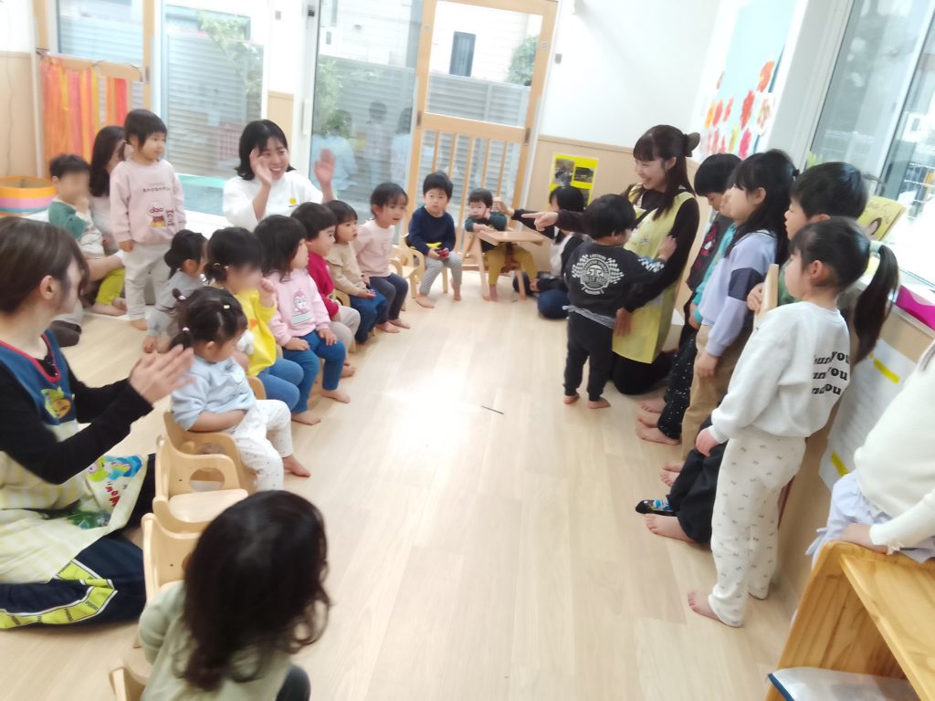 また、卒園していくHaku組さん(2歳児クラス)がクラスに来てくれて、卒園してしまうことやこれまで一緒に遊んだことを振り返り「一緒に遊んでくれてありがとう」と伝え合いました。