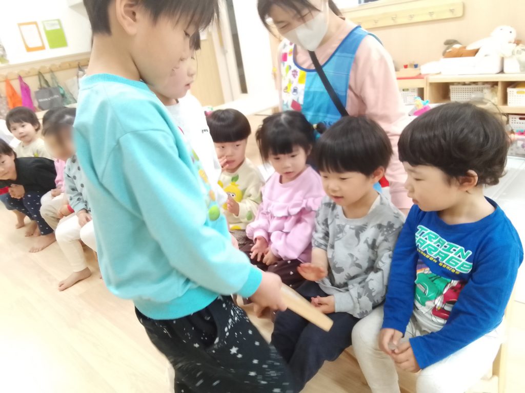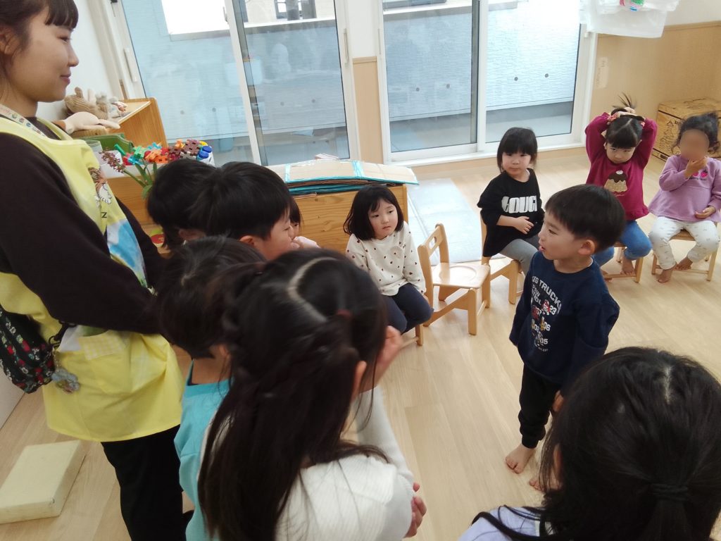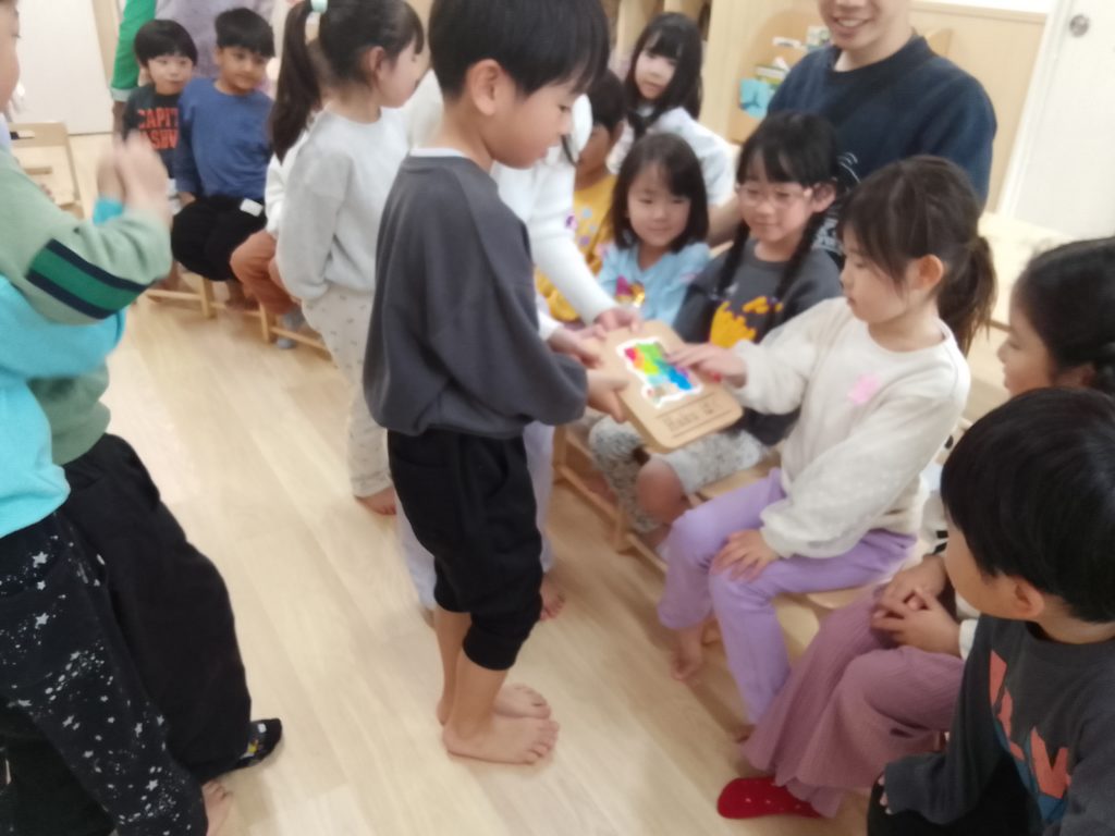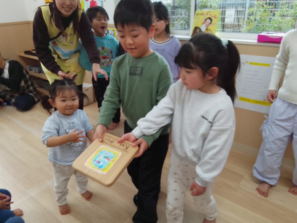 また、卒園していくHaku組さん(2歳児クラス)がクラスに来てくれて、卒園してしまうことやこれまで一緒に遊んだことを振り返り「一緒に遊んでくれてありがとう」と伝え合いました。