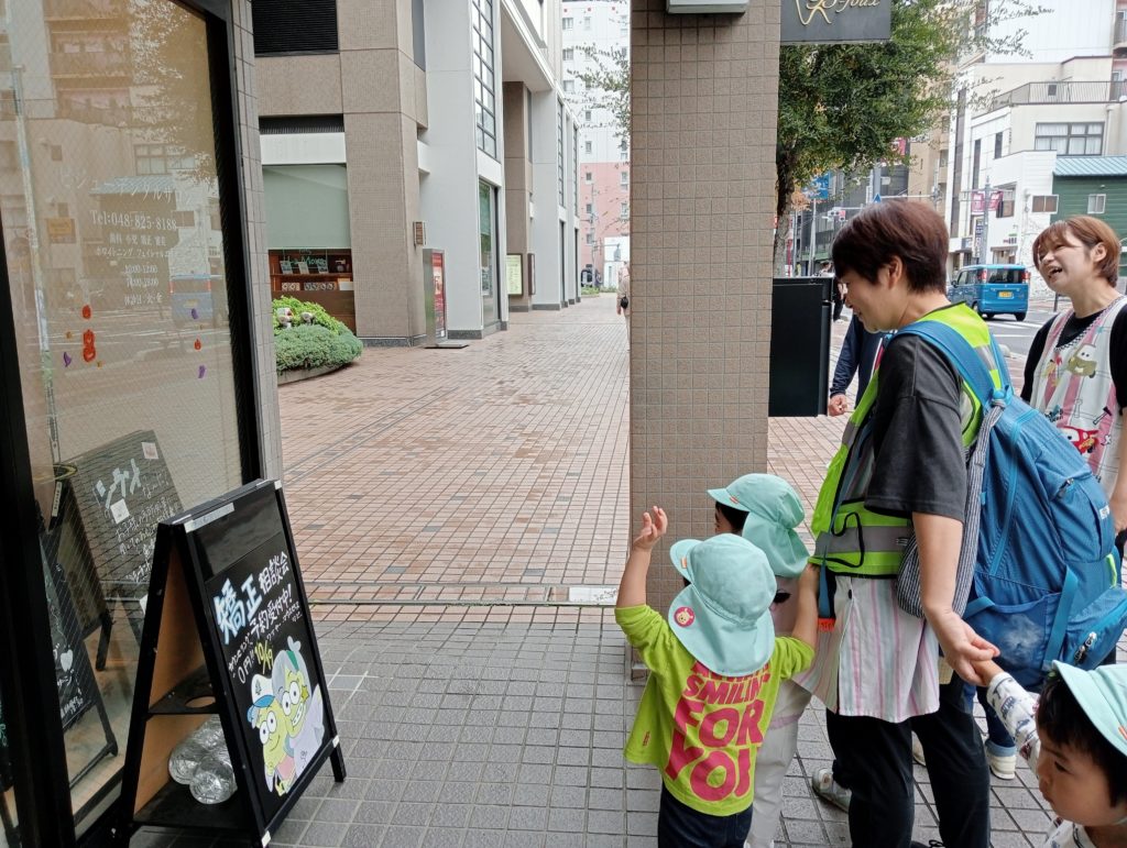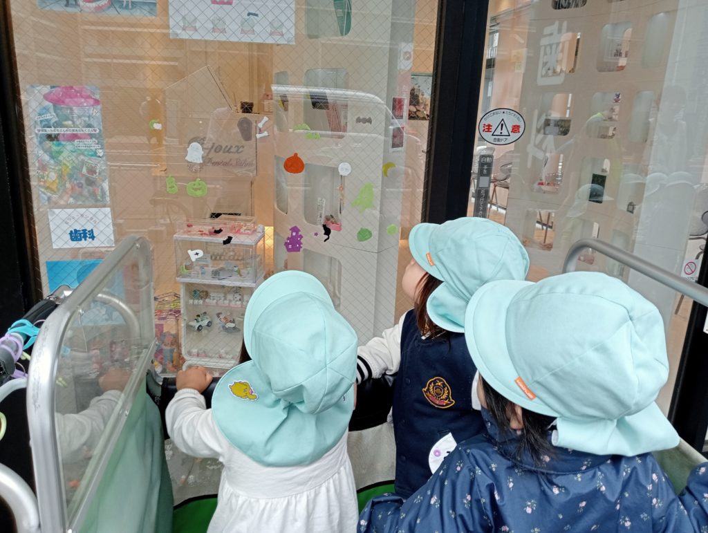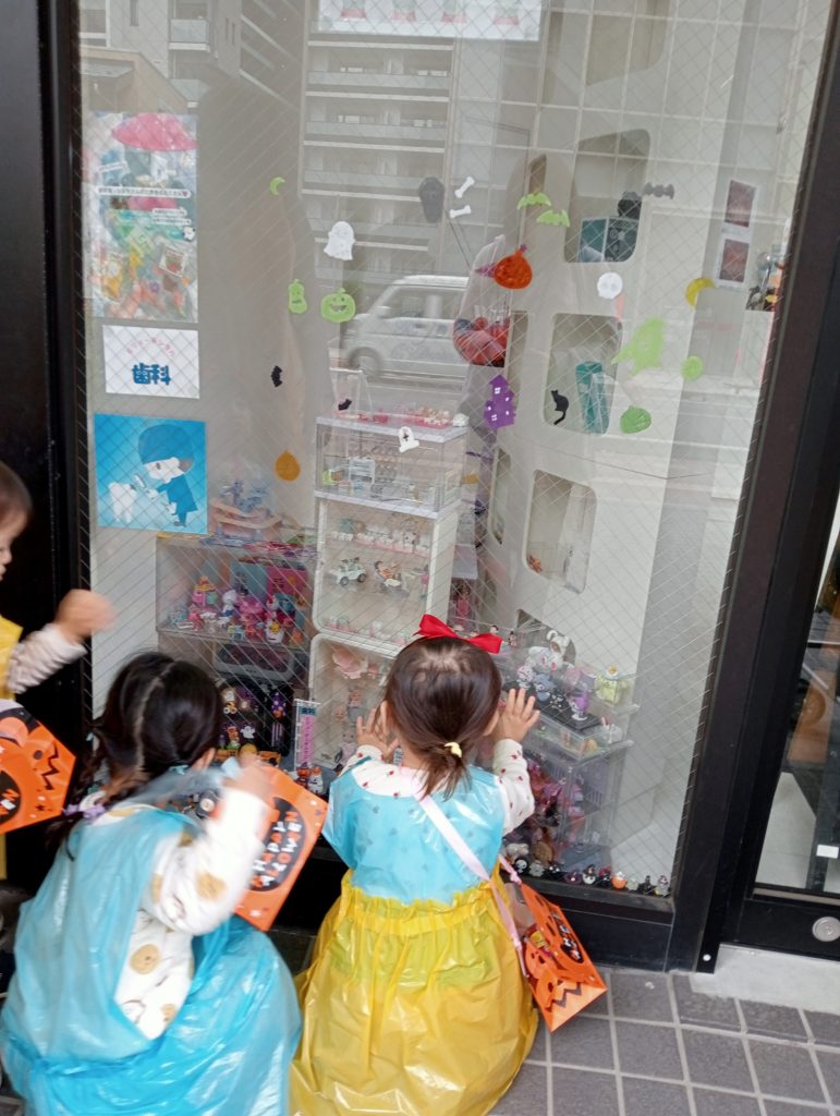 毎日のお散歩ではお花屋さん、カレー屋さん、電気屋さん、歯医者さんなど色々なお店にハロウィン飾りを見つけ「こんなところにもお店があるんだね」「看板にかわいい絵があるよ」と歩くたびに新しい発見をしながら子ども達の目が輝きました。