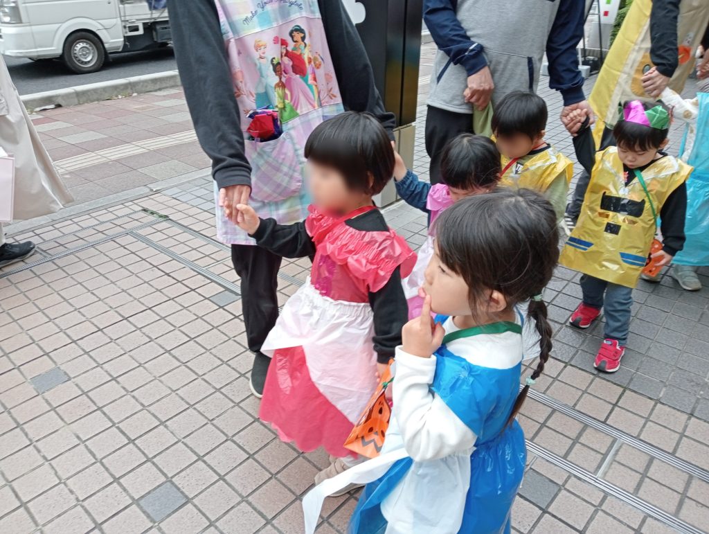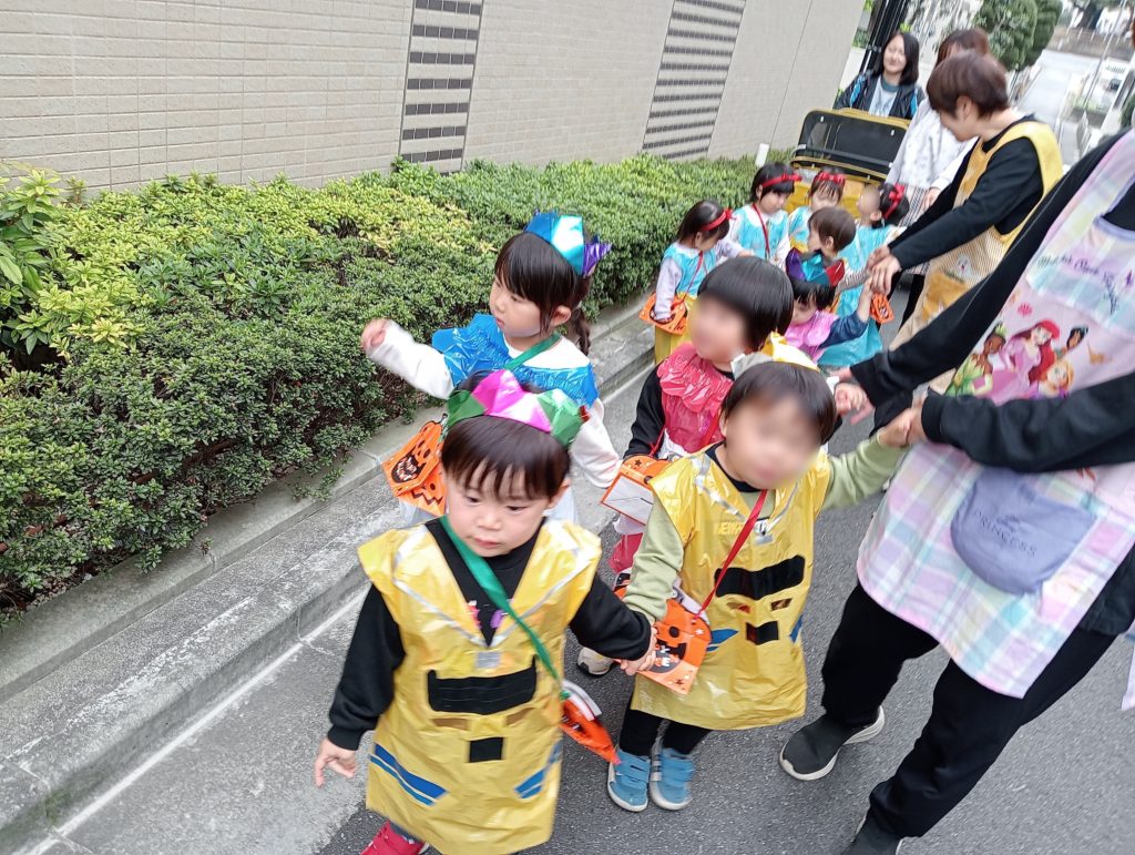 人とかかわる中で誰かと仲良くなる為の魔法のことばは「あいさつ」・・・仮装をして歩くという特別な散歩を通して、子ども達は地域の方と関わる楽しさや挨拶の心地よさを学んだ一日でした。