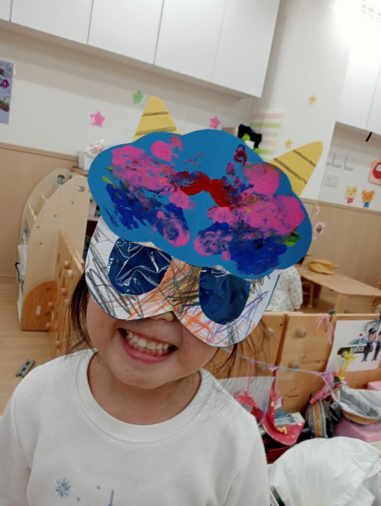 そして、節分当日、子どもたちは自分で作った鬼のお面をかぶって鬼になってみました。