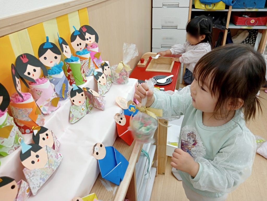 子どもたちの成長を願う気持ちとともに、絵本から広がった興味や気づきが制作へとつながり、自分で考えてつくる楽しさを感じるひな祭りとなりました。