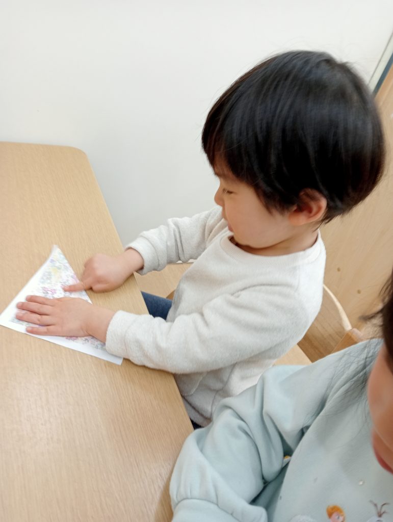 そんな中、Kai組(2歳児クラス)の子ども達から、「自分のお雛様をつくってみたい!」という声が上がり、折り紙でおひな様とお内裏様づくりが始まりました。